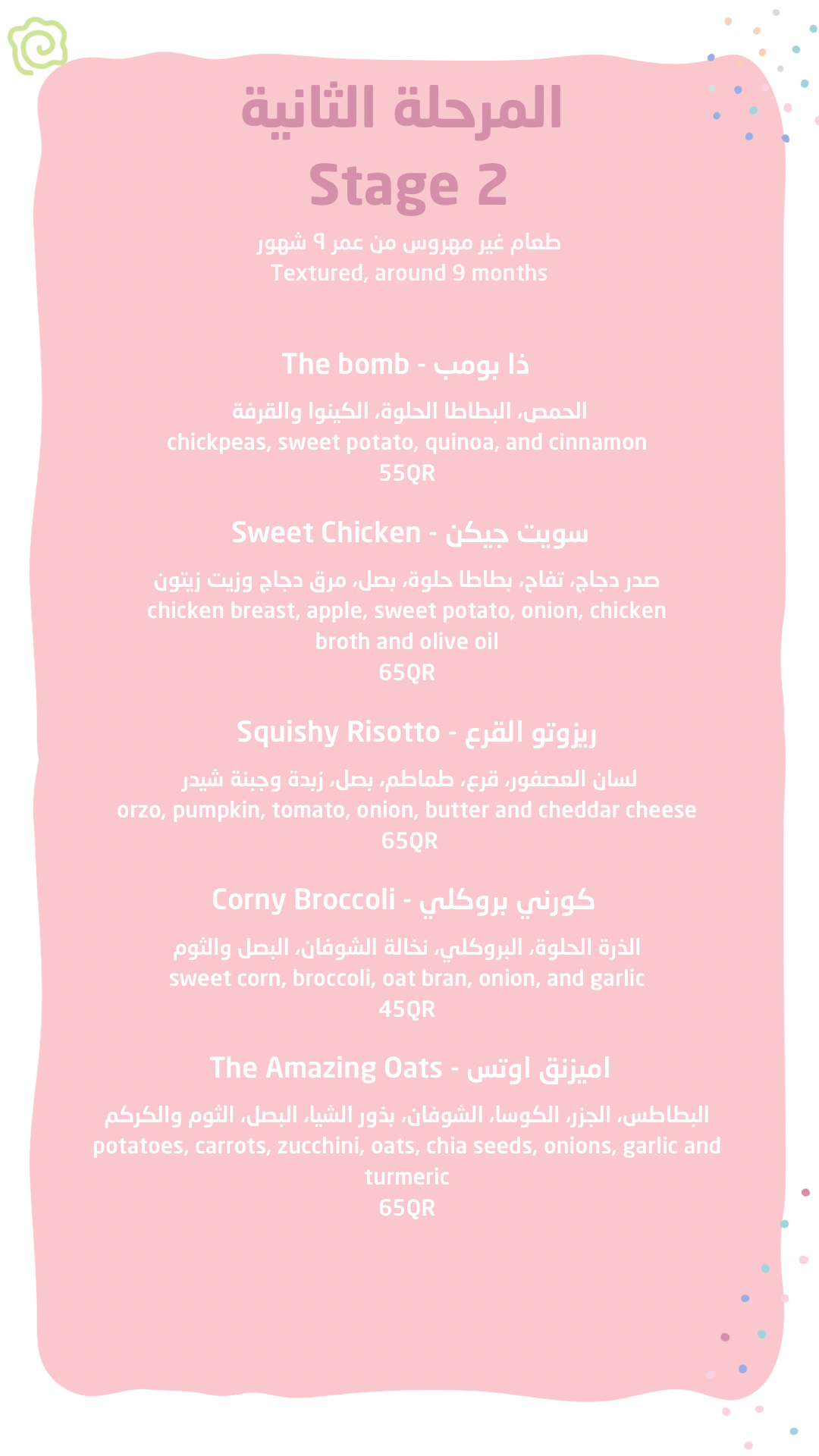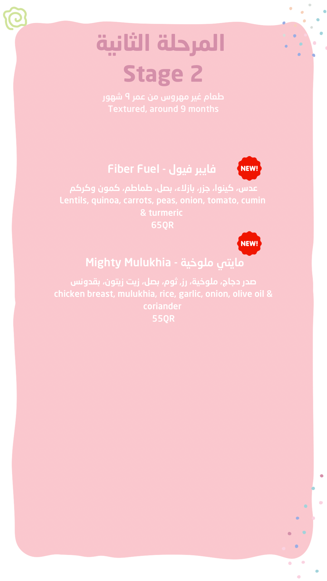 بعد أن أتقن طفلكِ تذوق نكهاته الأولى، حان الوقت للانتقال إلى المستوى التالي! تركز المرحلة الثانية على تقديم مزيج مغامر من النكهات وقوام أكثر سماكة (مهروس بالشوكة). تجمع هذه المجموعة قائمة طعام المرحلة الثانية بالكامل، والمصممة خصيصاً لمساعدة طفلكِ على تطوير مهارات المضغ وتوسيع ذائقته من خلال وجبات غنية ومكونات متعددة وممزوجة بعناية.